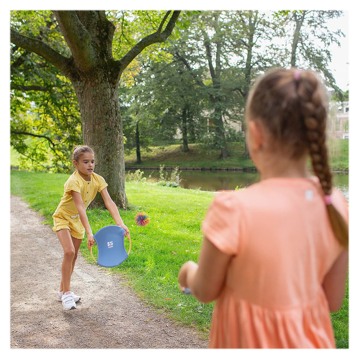 Setul include o minge pufoasa si doua rachete rotunde cu marginea din bambus si suprafata textila elastica, pe care trebuie sa le tii cu ambele maini pentru a lovi mingea pufoasa. Acest set de tenis reinventat constituie o activitate grozava in aer liber, fiind perfect pentru joaca pe plaja, in curte, in parc sau chiar in casa.