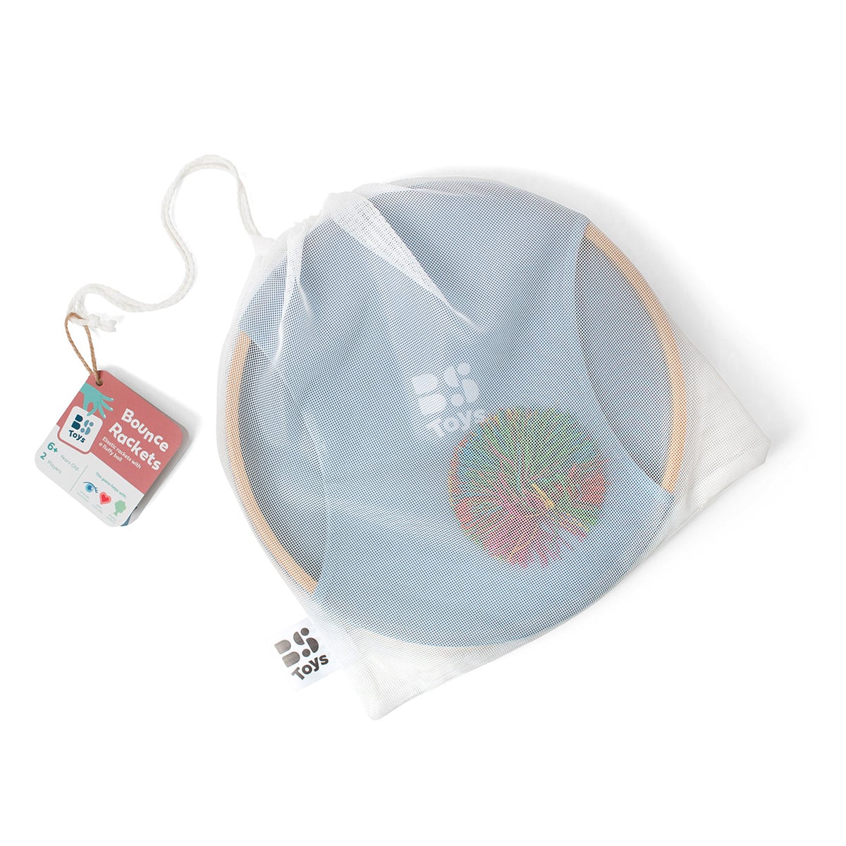 Setul Bounce Rackets este perfect pentru copiii mici, deoarece aceste rachete sunt usoare si pot fi tinute cu ambele maini, asigurand o mai mare precizie la lovire. Datorita rachetelor elastice si mingii pufoase din fire moi de cauciuc se poate juca in siguranta, fara a lovi pe nimeni. Daca mingea loveste accidental o fereastra, nu va provoca daune.