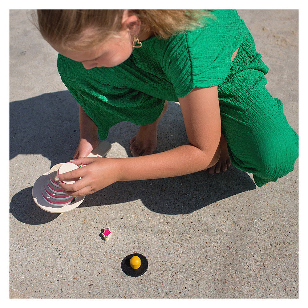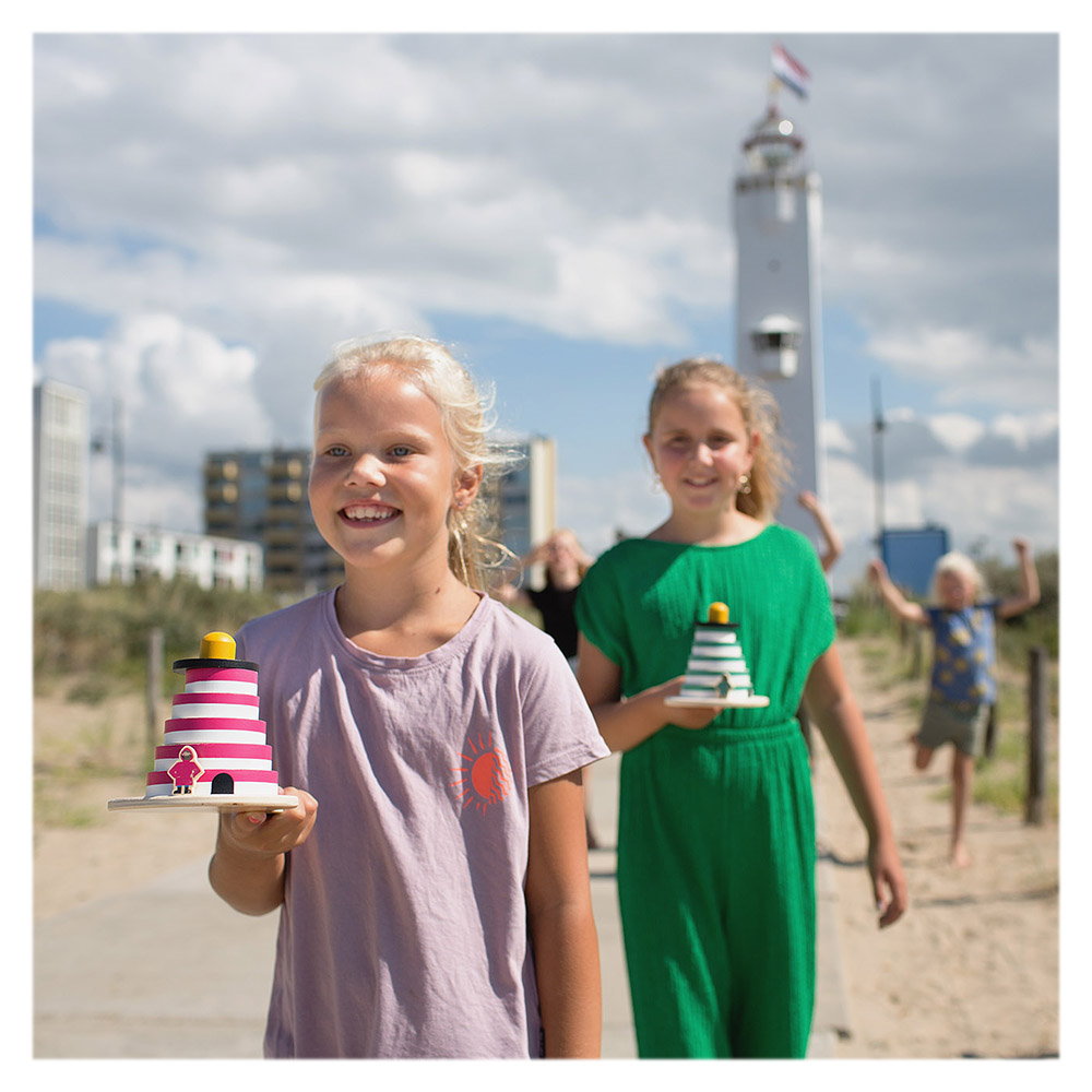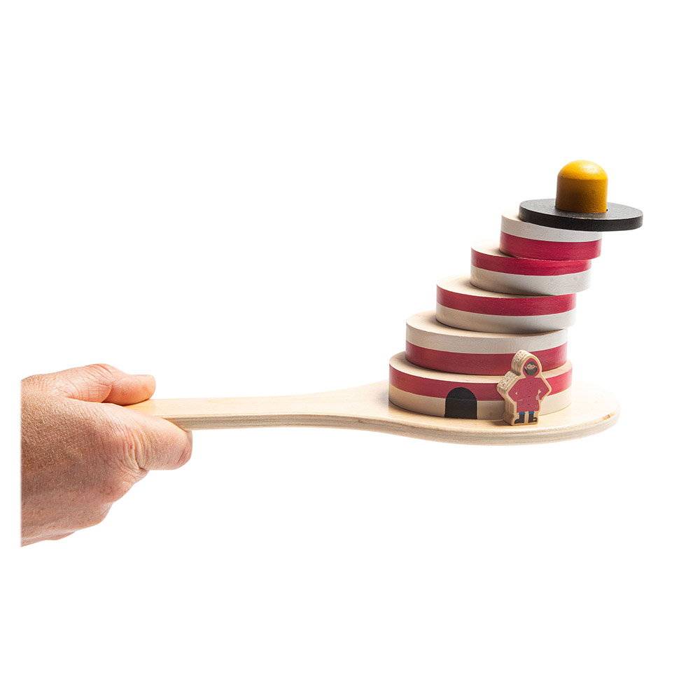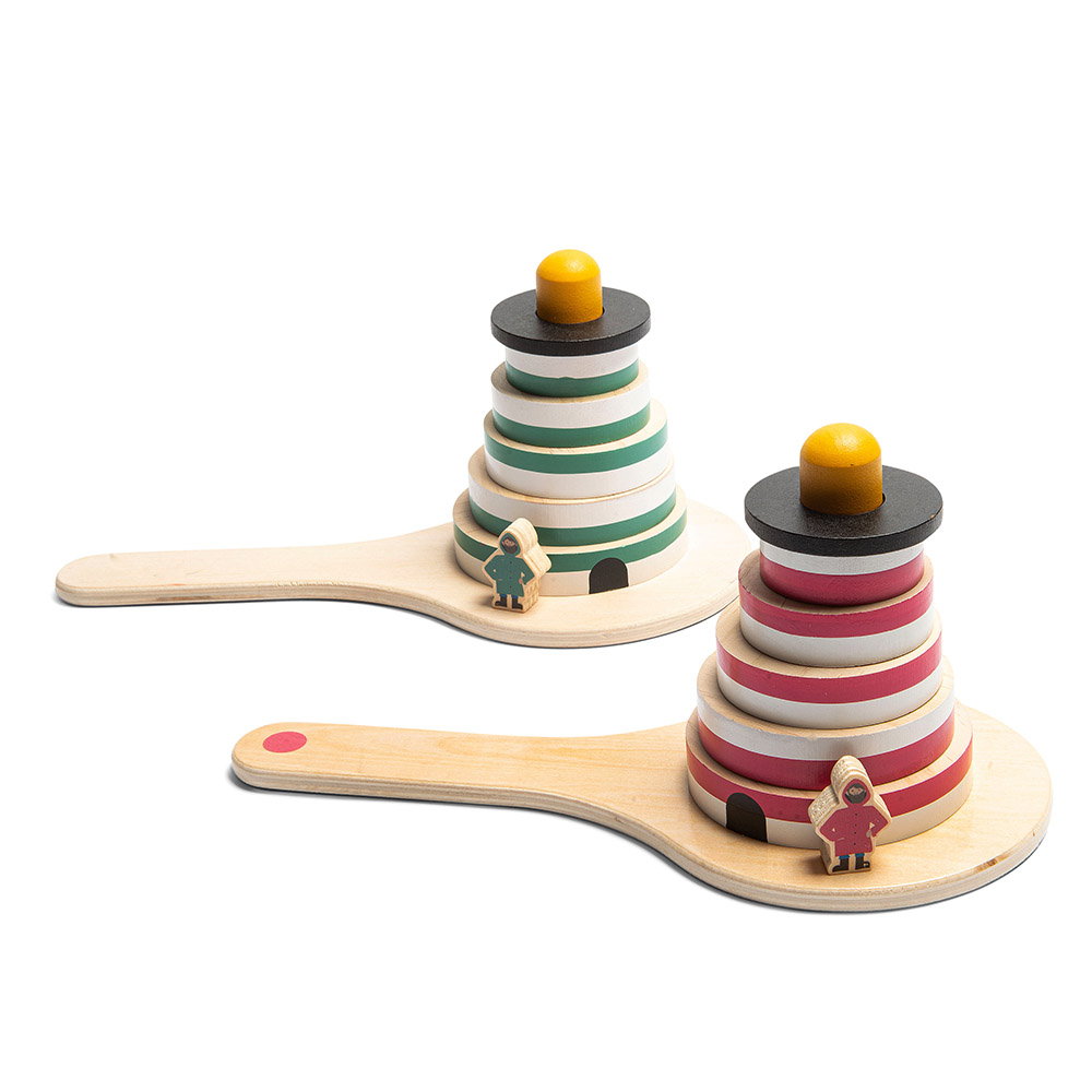 Jocul contine: 2 palete din lemn (27 x 13 cm), 14 piese rotunde din lemn (pentru construirea celor 2 faruri), 2 figurine paznic (3 x 2 x 1 cm).