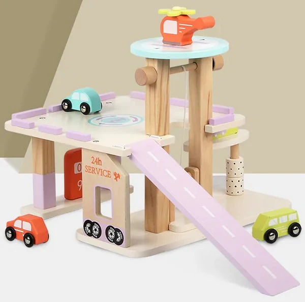 DISTRACȚIE PE MAI MULTE NIVELURI: Include 3 mașini de jucărie din lemn, un elicopter, service auto, precum si stație de alimentare a mașinilor.