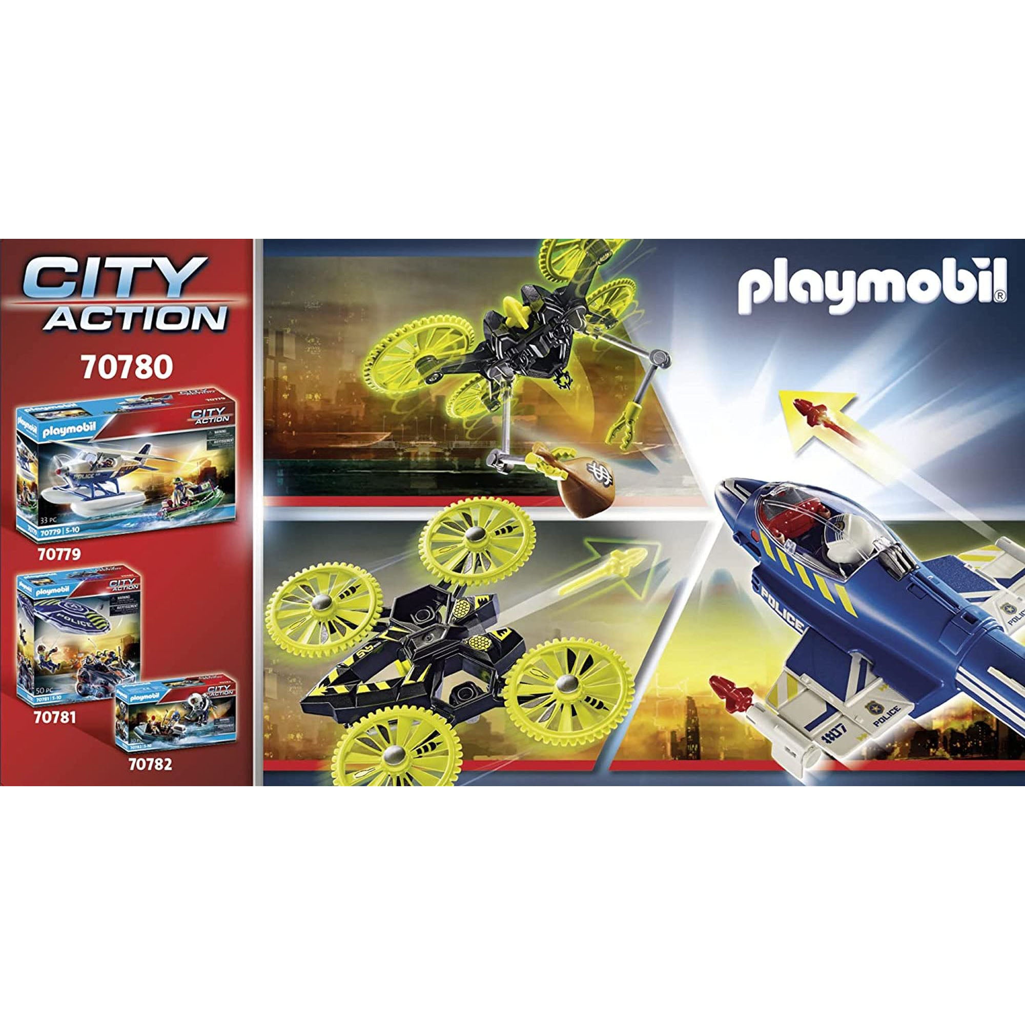 Un raufacator inteligent si-a construit o super drona si acum orasul nu mai este in siguranta. Dar acesta nu a luat in calcul politia PLAYMOBIL si avionul lor cool. In cel mai scurt timp, pilotul sare in cabina si pregateste avionul. Proiectilele sunt atasate de partea inferioara a aripilor si decoleaza. Dar ce este asta? De indata ce avionul a parasit solul, un proiectil trece la mustata dincolo de cabina pilotului. Pilotul reuseste sa o evite in ultimul moment. Raufacatorul se apropie din nou, iar dintii ascutiti ca de ferastrau ai dronei rateaza avionul la doar cativa centimetri. Incepe o cursa tensionata in aer! Setul include: 2 figurine, un avion de politie pliabil cu tunuri de tragere, o drona cu elice si pistol in miscare, casti, computere cu brat si multe alte accesorii. „Imi plac jucariile PLAYMOBIL pentru ca totul este atat de real. Imi place mult sa-mi creez propriul scenariu de joc cu figurine. Da, este foarte distractiv. ” un mic fan PLAYMOBIL Din 1974, sistemul de jucarii PLAYMOBIL, creat de Hans Beck, a devenit un clasic al locurilor de joaca pentru copii, cu numeroasele sale lumi creative – de la o nava cu pirati la un spital pentru copii. Circa 3,5 miliarde de figurine cu zambetul caracteristic au fost produse de atunci si incanta copiii din intreaga lume. Aproximativ 40 de scenarii de joc sunt distribuite in aproape 100 de tari de pe glob. Atat parintii, cat si educatorii apreciaza sistemul de jucarii PLAYMOBIL ca fiind un reprezentant al jocului creativ de inalta calitate. Joc creativ de rol cu PLAYMOBIL Principiul unic de joc stimuleaza imaginatia si creativitatea, promovand dezvoltarea copilului. PLAYMOBIL aduce “o lume in miniatura”, in care copiii pot interpreta diferite roluri, pot crea sau reproduce povesti, aventuri si situatii din viata reala. Cu multiple talente, aceste figuri vesele depasesc cu succes tot felul de provocari – spre exemplu cavaleri sau pirati in scenarii istorice, ca muncitori in constructii, veterinari si politisti din lumea de azi sau ca agenti secreti in lumi virtuale. Oamenii creativi de la PLAYMOBIL vin in mod constant cu idei si completari noi pentru a le oferi celor mici de pretutindeni distractie de lunga durata.
