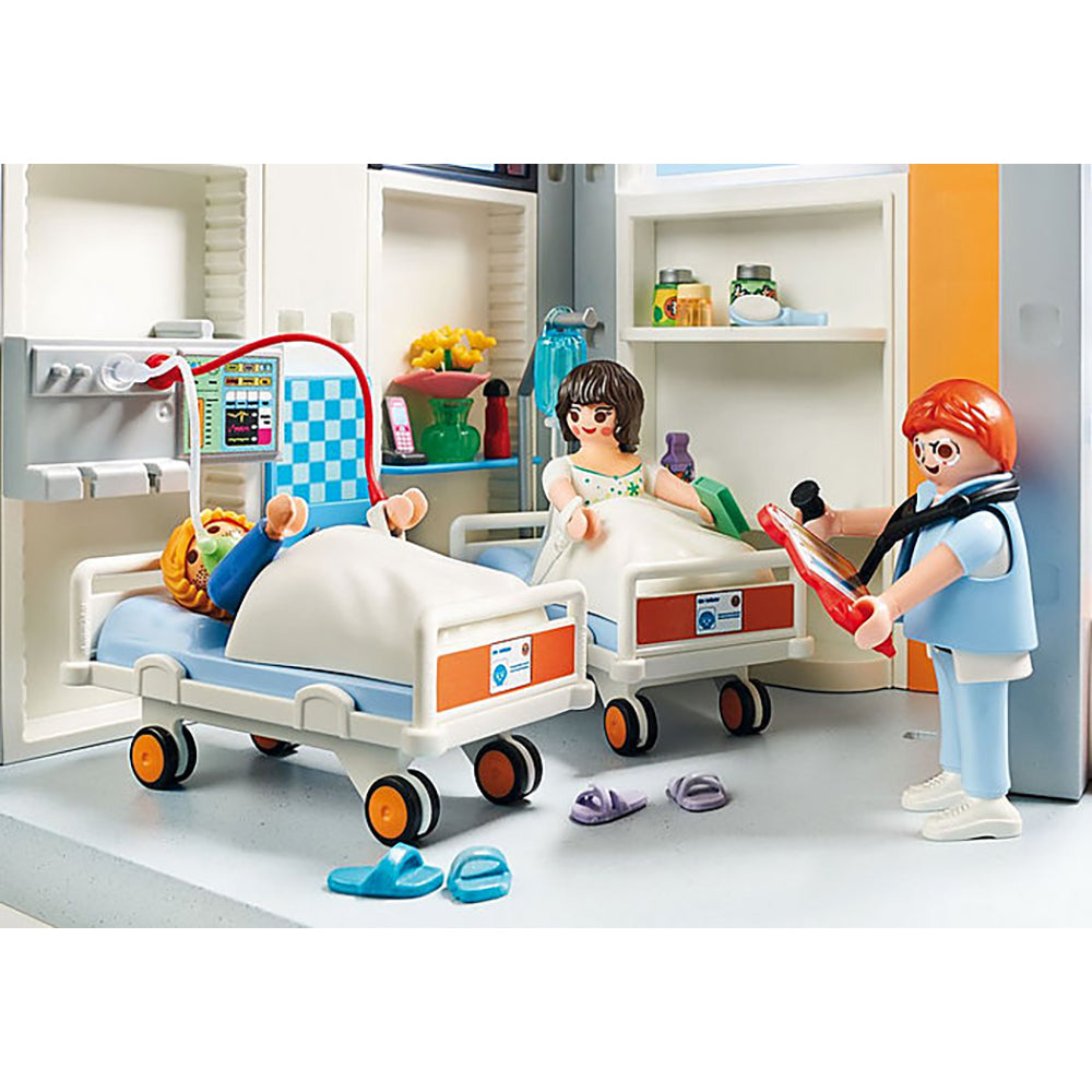 Poti adauga un Salon spital mobilat de la PLAYMOBIL, astfel incat centrul tau de doctori sa fie si mai mare si sa poata sa gazduiasca cat mai multe figurine. Sala de operatie de la parter este echipata cu un bloc de lumini functional (necesita o baterie de 1.5V) care se poate misca in stanga sau dreapta, sus sau jos, un stand de perfuzie si toate echipamentele necesare, de ultima tehnologie. Sala de asteptare pentru operatii este dotata cu doua targi, cu care pacientii sunt plimbati dintr-un salon in altul de catre doctori. Salonul are usi si fereste mari din sticla ca pacientii si medicii sa se poata bucura de lumina soarelui. Setul include: 4 figurine, un salon si multe alte accesorii. . „Imi plac jucariile PLAYMOBIL pentru ca totul este atat de real. Imi place mult sa-mi creez propriul scenariu de joc cu figurine. Da, este foarte distractiv. ” un mic fan PLAYMOBIL Din 1974, sistemul de jucarii PLAYMOBIL, creat de Hans Beck, a devenit un clasic al locurilor de joaca pentru copii, cu numeroasele sale lumi creative – de la o nava cu pirati la un spital pentru copii. Circa 3,5 miliarde de figurine cu zambetul caracteristic au fost produse de atunci si incanta copiii din intreaga lume. Aproximativ 40 de scenarii de joc sunt distribuite in aproape 100 de tari de pe glob. Atat parintii, cat si educatorii apreciaza sistemul de jucarii PLAYMOBIL ca fiind un reprezentant al jocului creativ de inalta calitate. Joc creativ de rol cu PLAYMOBIL Principiul unic de joc stimuleaza imaginatia si creativitatea, promovand dezvoltarea copilului. PLAYMOBIL aduce “o lume in miniatura”, in care copiii pot interpreta diferite roluri, pot crea sau reproduce povesti, aventuri si situatii din viata reala. Cu multiple talente, aceste figuri vesele depasesc cu succes tot felul de provocari – spre exemplu cavaleri sau pirati in scenarii istorice, ca muncitori in constructii, veterinari si politisti din lumea de azi sau ca agenti secreti in lumi virtuale. Oamenii creativi de la PLAYMOBIL vin in mod constant cu idei si completari noi pentru a le oferi celor mici de pretutindeni distractie de lunga durata.